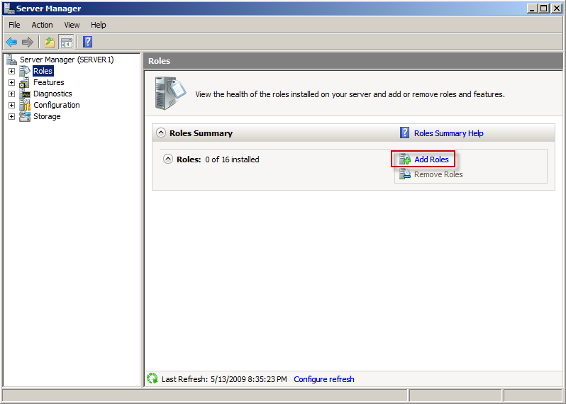 Zde označíme v levém panelu uzel Roles a v pravém panelu klepneme na odkaz Add Roles (viz obr. 101), čímž spustíme průvodce přidáním role.