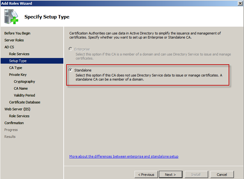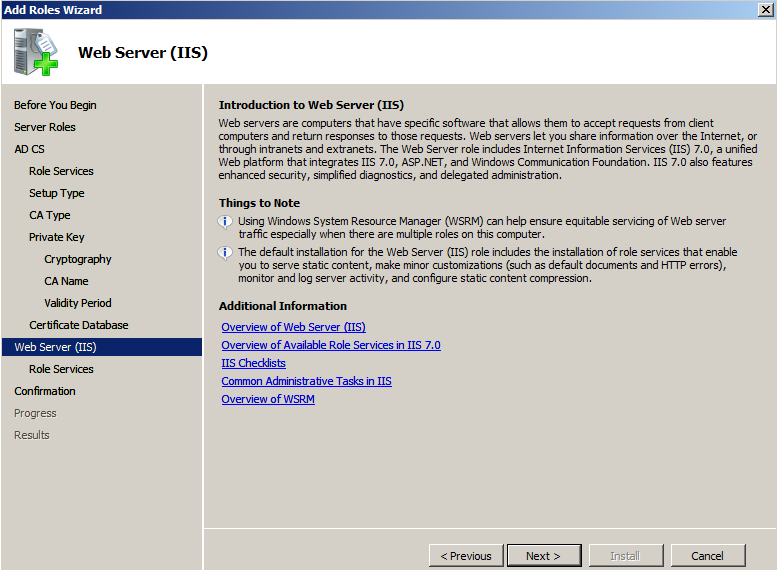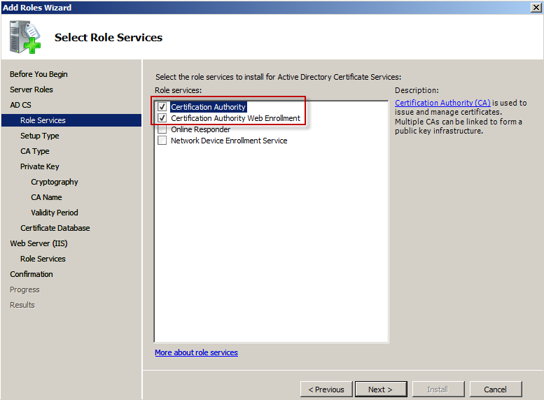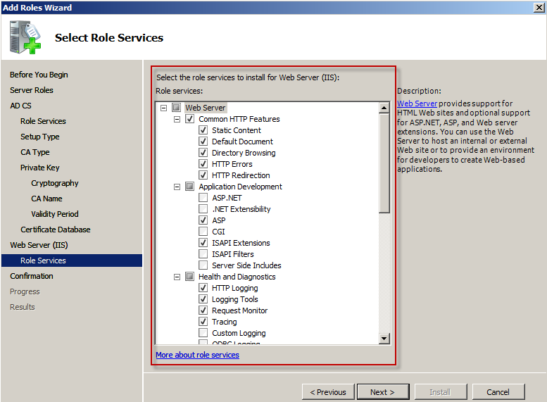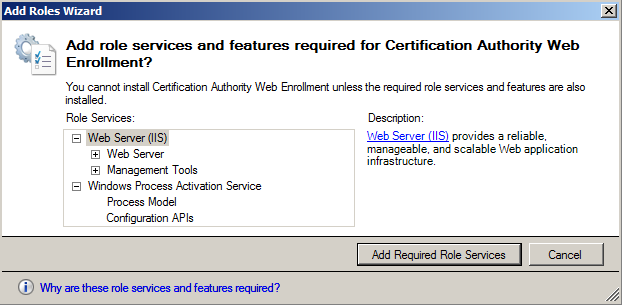 Při instalaci certifikační autority je také vhodné vzít v potaz, zda má server poskytovat uživatelům webové rozhraní. Pokud ano, budeme muset nainstalovat tzv. službu role s názvem Web Enrolment a s ní spojené komponenty jako webový server IIS a některé jeho součásti.
