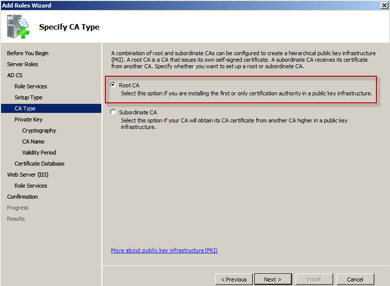 V tomto konkrétním případě nasazujeme samostatnou kořenovou certifikační autoritu. K provedení tohoto postupu tedy potřebujeme server s operačním systémem Windows Server 2008, který má nastavenou statickou adresu IP a korektně nastaveny vlastnosti protokolu TCP/IPv4 a/nebo TCP/IPv6. Samozřejmostí budiž oddíl naformátovaný systémem souborů NTFS.