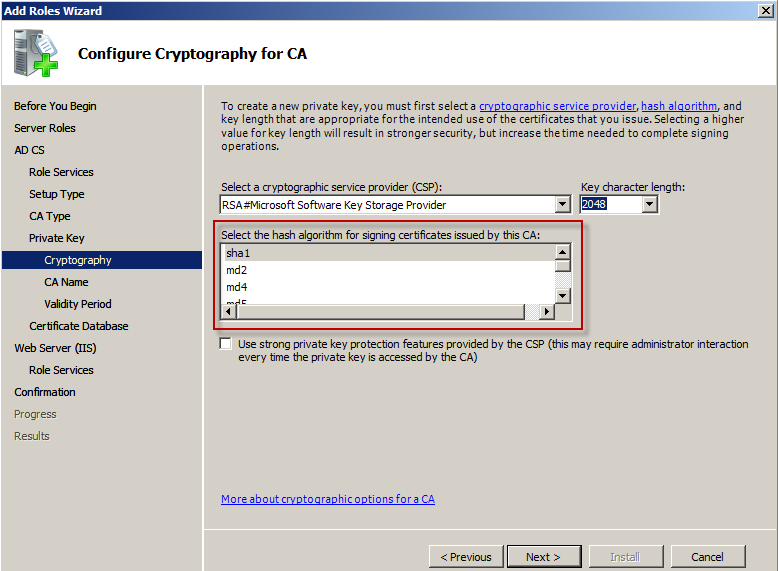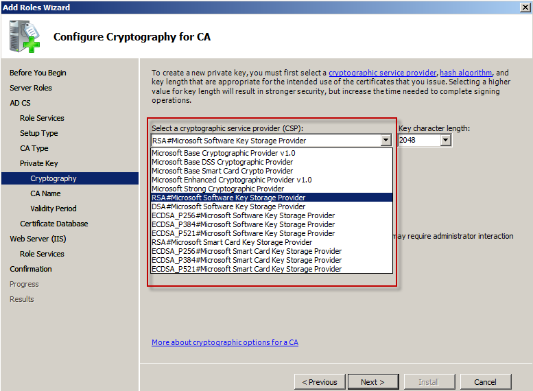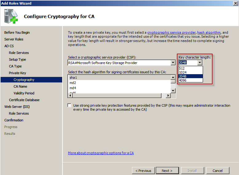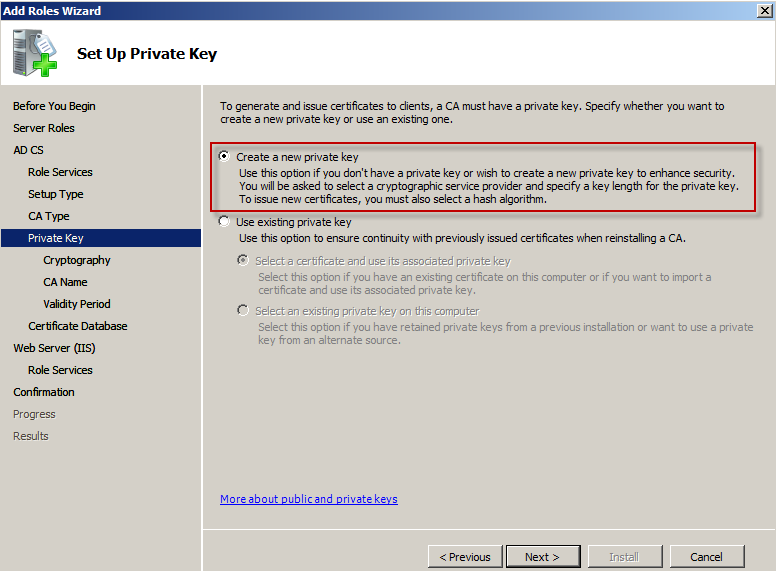 7. Nyní máme možnost určit, zda se vygeneruje nový privátní klíč nebo se použije již existující. Existující klíč bychom použili v případě, že se jedná např. o reinstalaci serveru, který již dříve certifikační služby poskytoval.