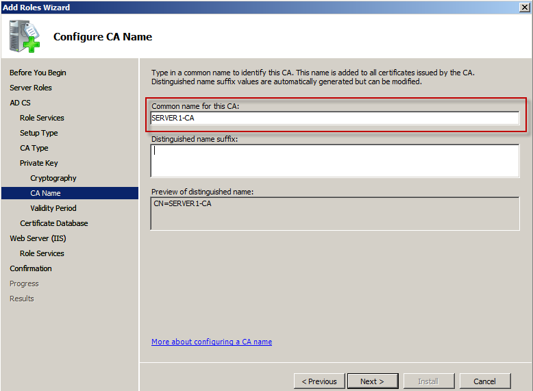 9. Na další obrazovce nastavíme název certifikační autority (viz obr. 112), který bude figurovat ve vydávaných certifikátech. Je zde také možno doplnit příponu rozlišujícího názvu.