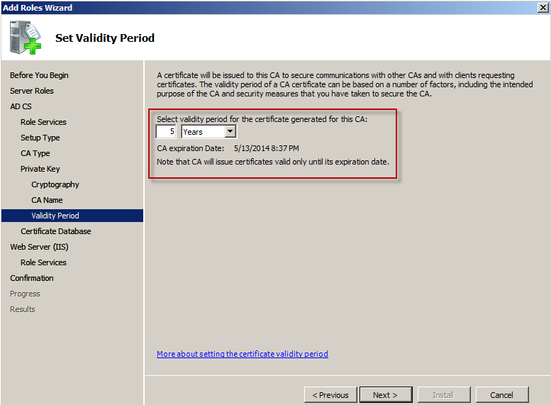 10. Na obrazovce > Set Validity Period nanastavíme dobu platnosti vydávaných certifikátů (viz obr. 113).